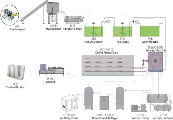 2-成型系統(tǒng):轉(zhuǎn)鼓式成型機(jī),模具,空壓機(jī),空壓機(jī)罐,真空泵,真空罐,高壓水泵,汽水分離泵等。